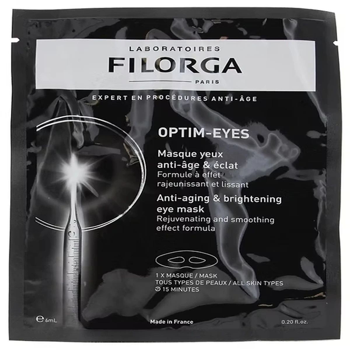 Su fórmula innovadora ofrece efectos rejuvenecedores y suavizantes. Enriquecida con péptidos marinos, ácidos hialurónicos y antioxidantes (extracto de cúrcuma), la mascarilla OPTIM-EYES actúa en la zona del contorno ocular y ofrece una acción correctiva intensiva sobre las ojeras, la hinchazón y las arrugas.